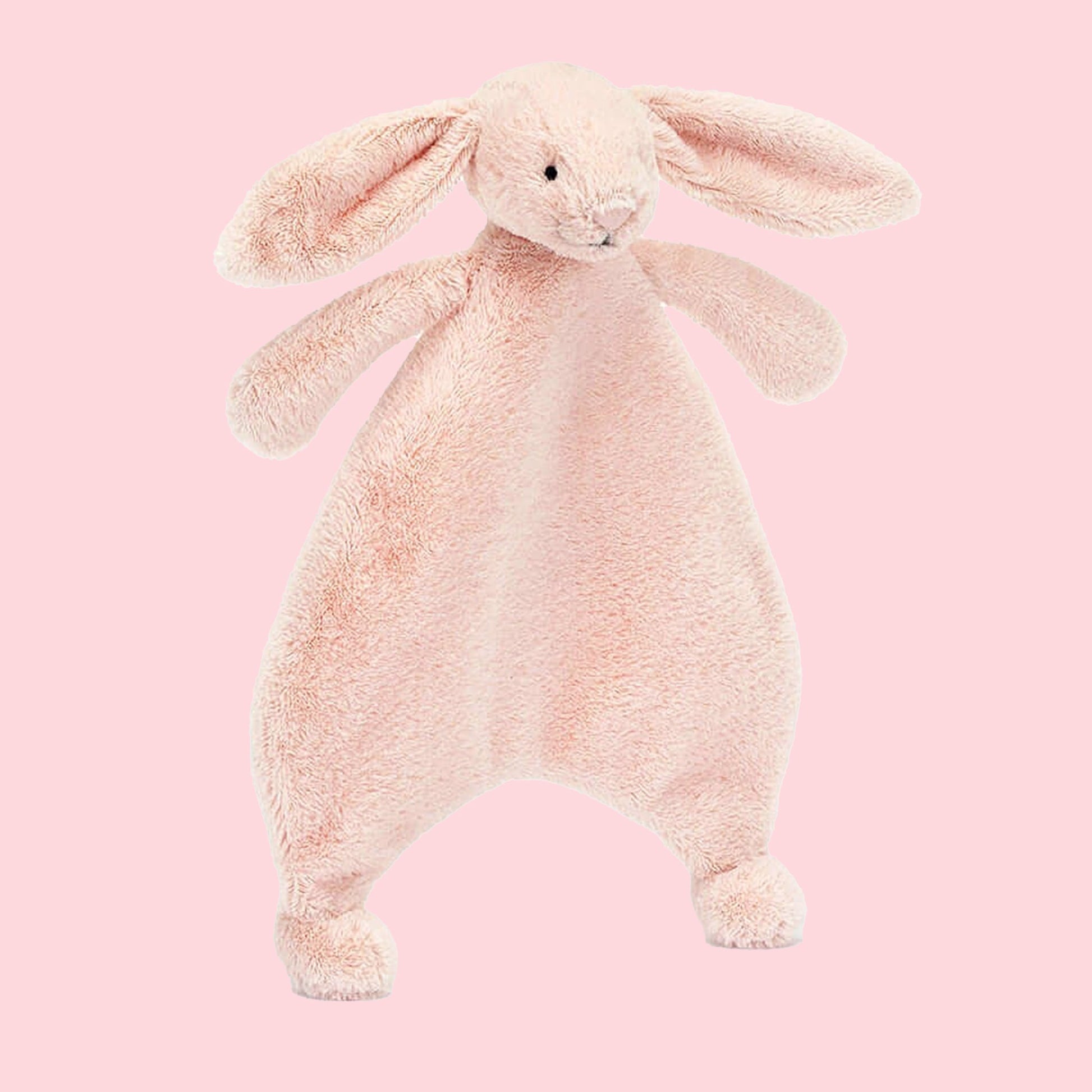 Irresistibly soft in a blush pink colored fur made from recycled fibres, Bashful Blush Bunny Comforter features our beloved Bashful Bunny signature long lop ears, a pink suedette nose and embroidered eyes. Designed with an un-stuffed body yet delicately squashy paws and bobble feet, making it easy for little hands to grab hold of and comfort themselves.