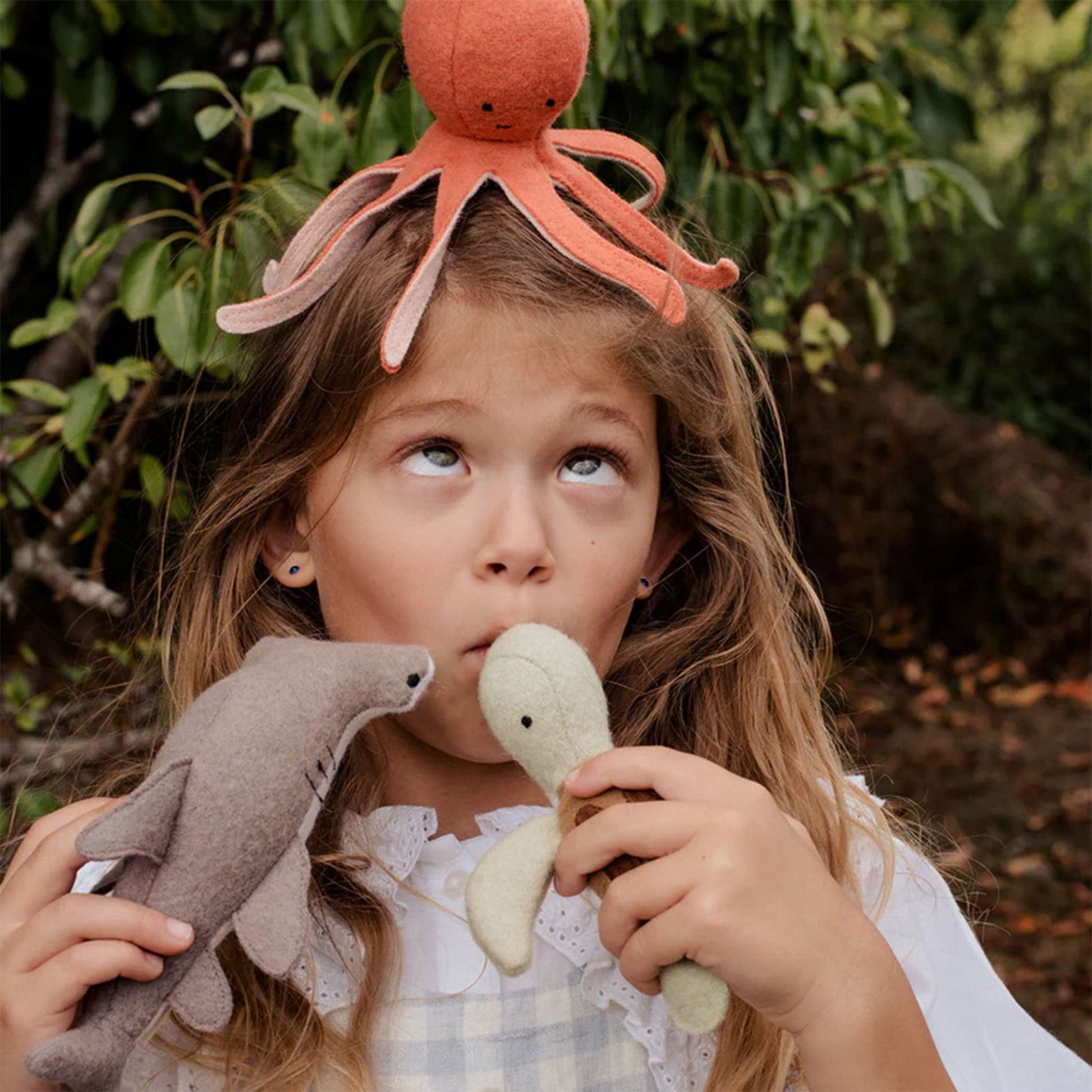 Handmade with love from a soft wool blend with embroidered features, each Holdie Animal will look a little bit different, and that makes each one quite special. Includes the octopus, sea turtle and hammerhead shark.