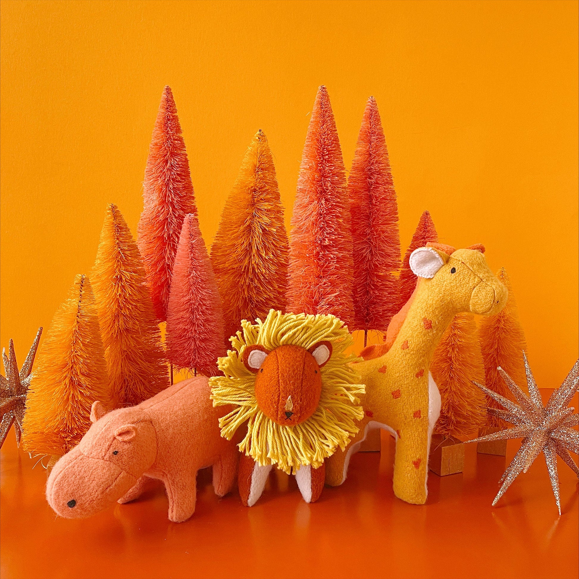 Handmade with love from a soft wool blend with embroidered features, each Holdie Animal will look a little bit different, and that makes each one quite special. Included in this set is the friendly lion, the giant giraffe and the sweet pink hippo!