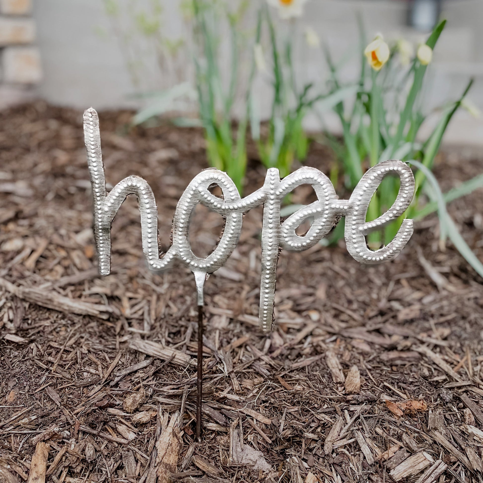 Share hope by adding this beautiful, handcrafted metal plant stake to your flower pot or garden.