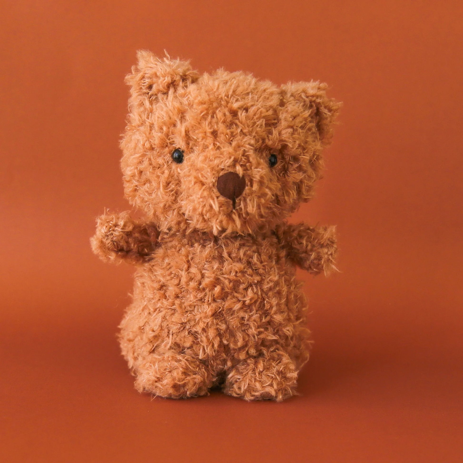 Little Bear is such a snoozy sweetpea. Fuzzly-soft in vintage toffee tussles, with wee bobble paws and a choolate-drop nose, this shy little snuggler wants to meet a loving friend. A classic pocket pal.