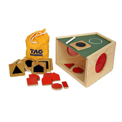 For very young children the tactile exploration of objects in the environment is of most importance. Mental image imprinting through tactile sensory experiences seems to be much more efficient than through the visual or auditory modes. As Maria Montessori advocated, it is through the hand that the child brings in and assimilates the environment. The Mystery Box provides for a wide range of tactile experiences from basic shape recognition to fine size and shape discrimination. This learning center comes with 10 solid wood shapes and 10 matching shape tiles, and chalk for drawing exercises.