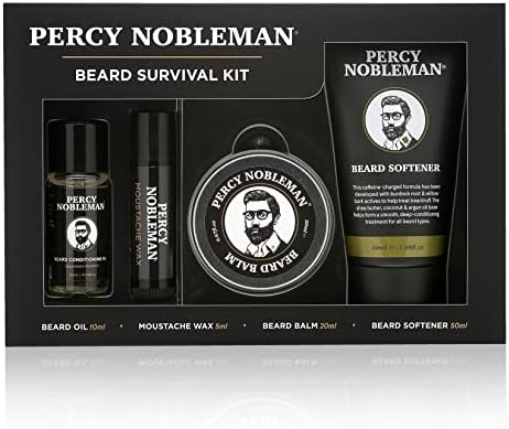 Percy Nobleman Beard Survival Kit, a Beard Grooming Kit containing a scented beard oil, beard balm, moustache wax, and a beard softener