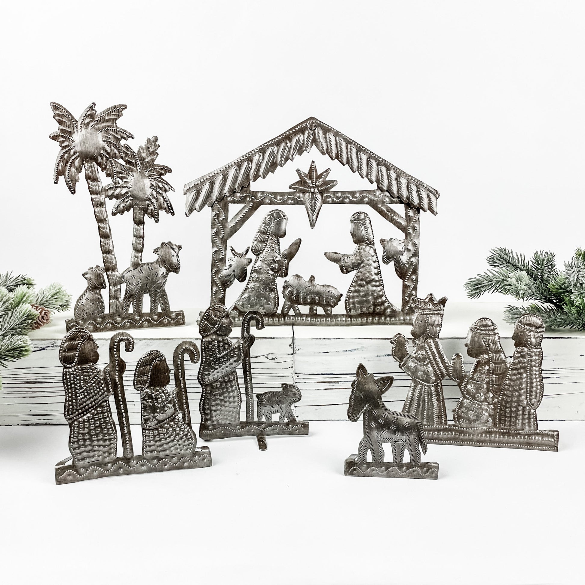 This six-piece metal Christmas nativity scene, handcrafted by artisans at Papillon Enterprise in Haiti, creates a beautifully reverent scene of that most holy night. Displayed beneath the Christmas tree, on a mantle, or on a foyer table or shelf, this nativity keeps Christ at the center of Christmas and will become a treasured heirloom for generations to enjoy. A Christmas gift of faith for family and friends and also makes an unforgettable housewarming gift.